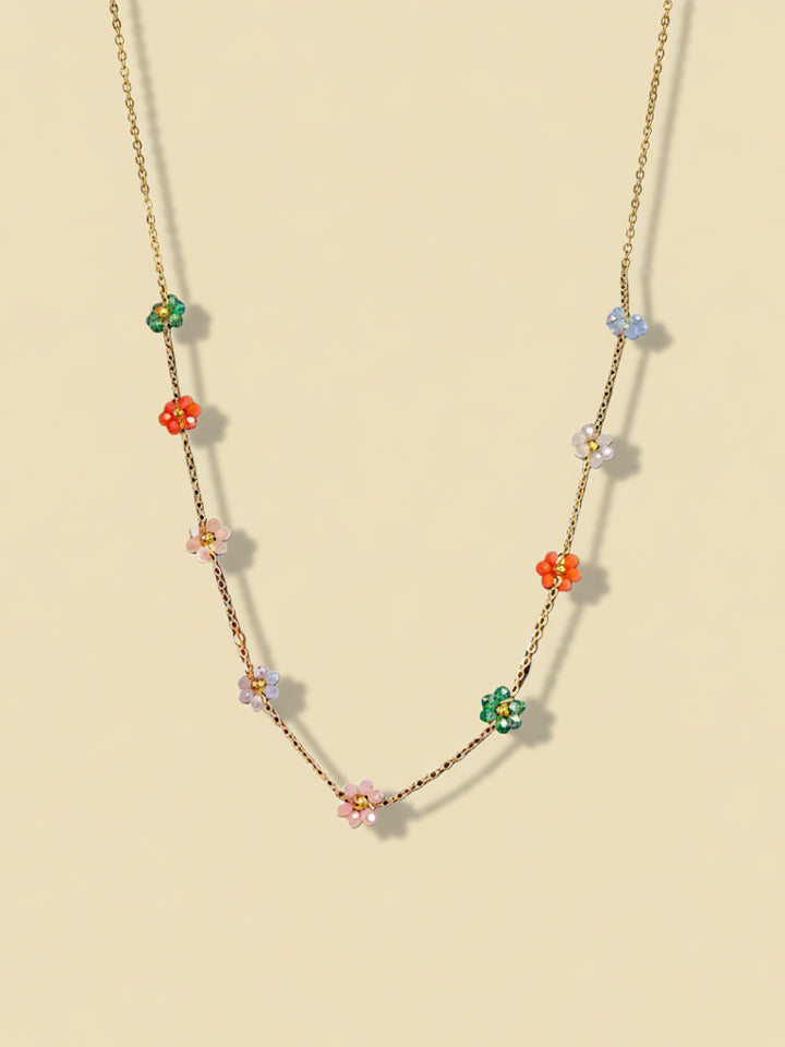 Gold-tone chain adorned with delicate multi-color floral charms in pastel and vibrant hues — a playful, youthful piece that adds a pop of color to any outfit.