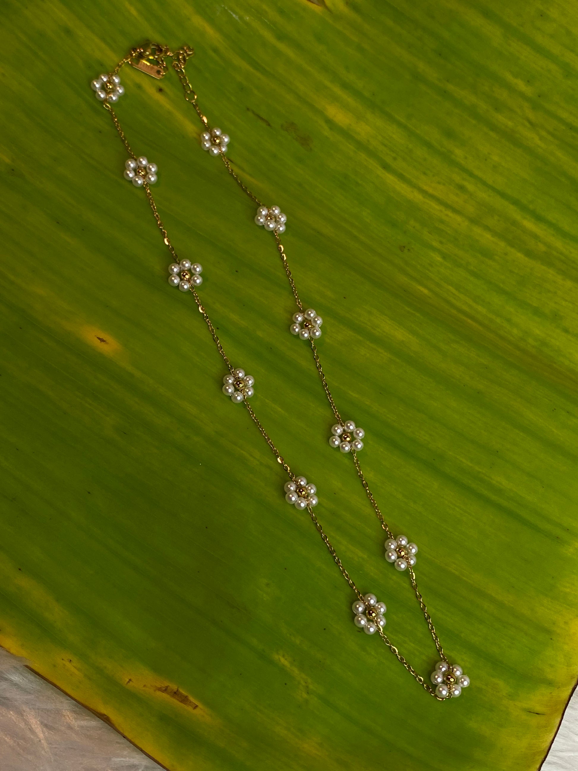 Gold-tone chain adorned with delicate pearl flower charms, creating a timeless and feminine look perfect for festive wear or everyday sophistication.