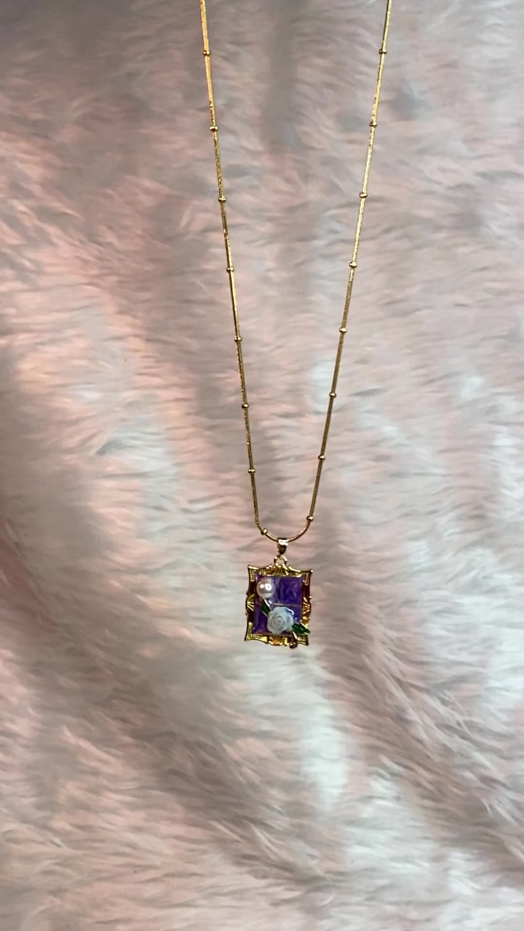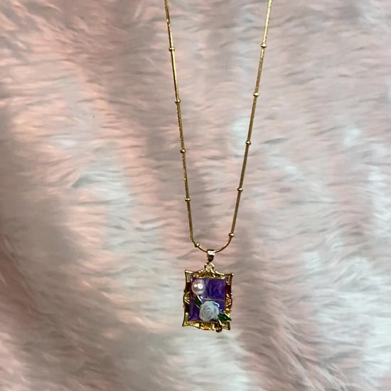 Gold-tone chain with fine bead accents, featuring a rectangular lilac pendant framed in an ornate gold border, detailed with a grey rose, pearl accent, and green enamel leaves — a chic blend of vintage artistry and modern styling.